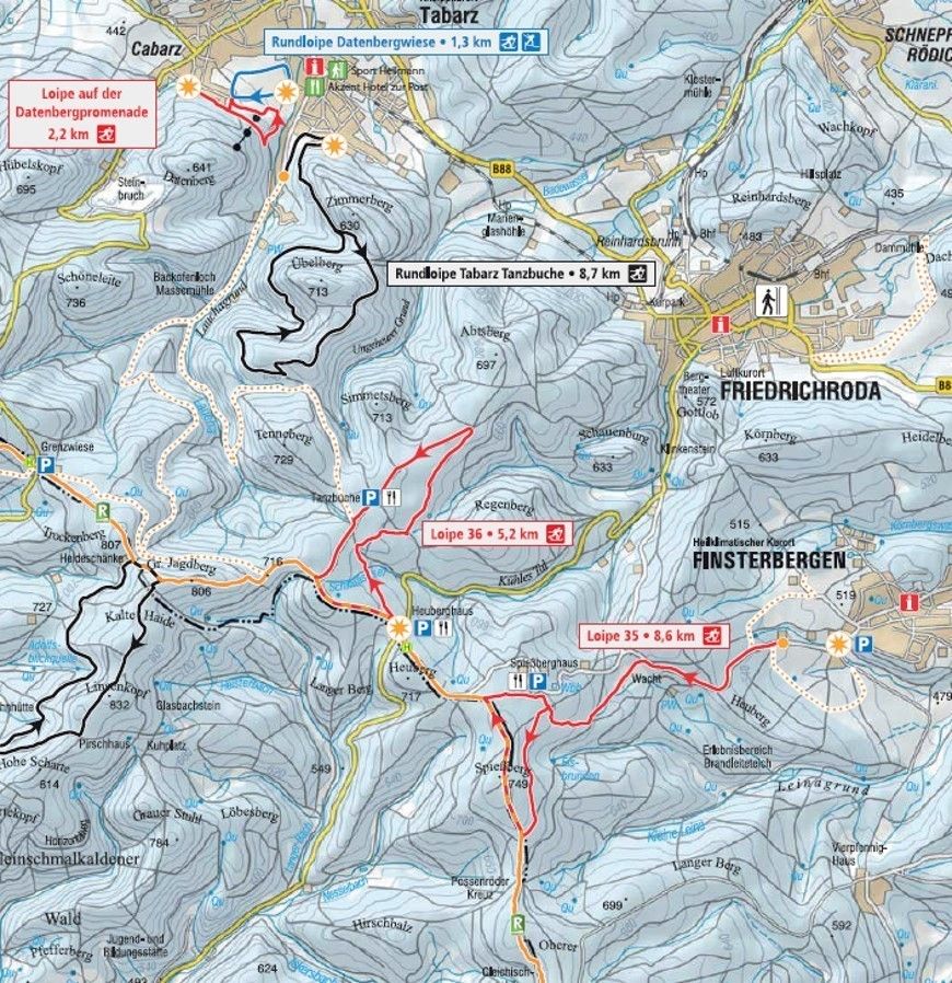 Friedrichroda vous offre env. 17 km de pistes de ski de fond et 30 km de chemins de randonnée hivernale. Le parcours le plus longue et plus intéressant se situe dans le quartier de Finsterbergen et vous permet de skier dans les forêts.