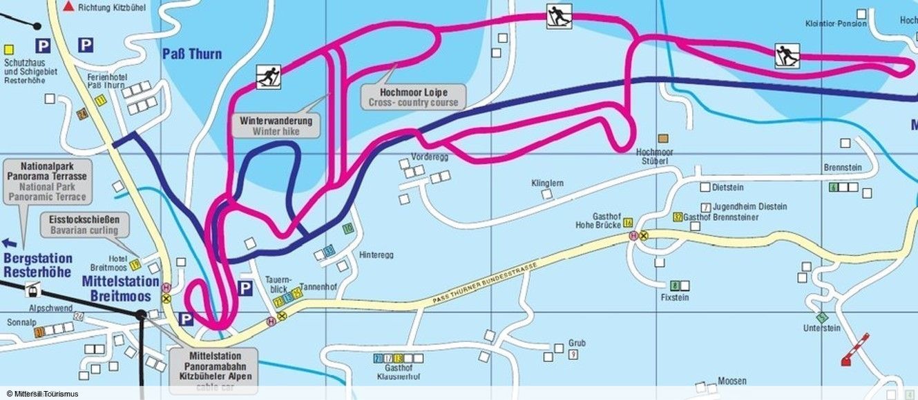 La piste panoramique de 10 km de Hochmoor, à laquelle vous accéder depuis le col de Thurn, est à recommander. À une altitude de 1 274 m, vous profiterez d'une vue imprenable sur la chaîne de montagnes du Hohen Tauern. Vous trouverez à Mittersill une piste de brouillard de 3 km de long.